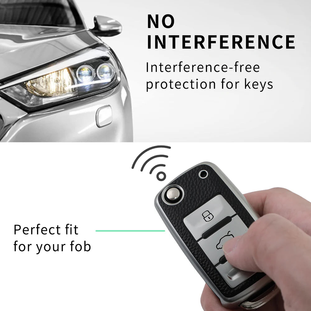 leather TPU key cover for Volkswagen Polo, Vento, Jetta, Ameo 3 button flip key – Silver Black